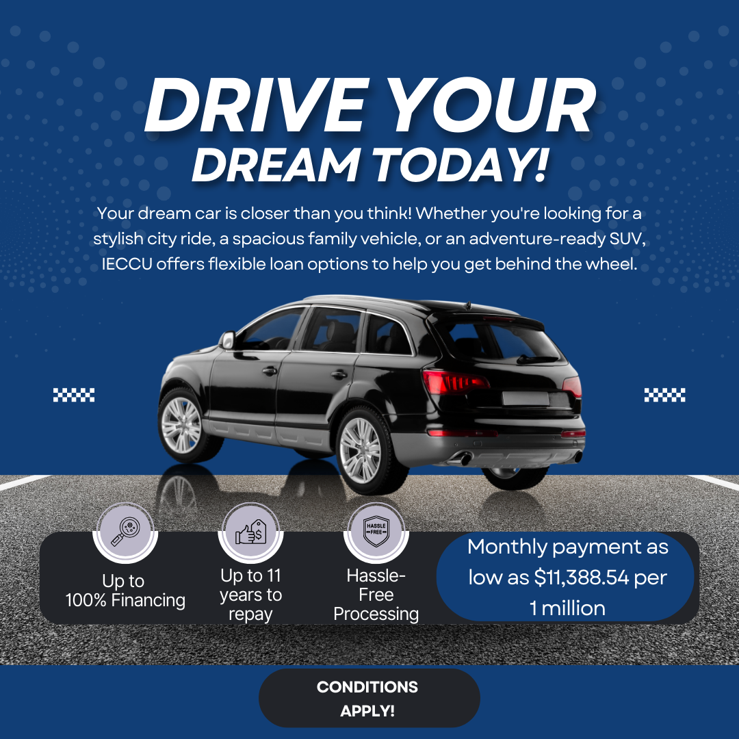 Other Collateral: You can be granted a loan for the expressed purpose of purchasing a car without having to use the car as security. Other collateral accepted are shares and other funds held at IECCU, cash instruments held at other financial institutions, co-makers, real estate or any other security deemed appropriate by the Credit Union. It is of importance to note, that where real estate is used, the process can be a very lengthy one.